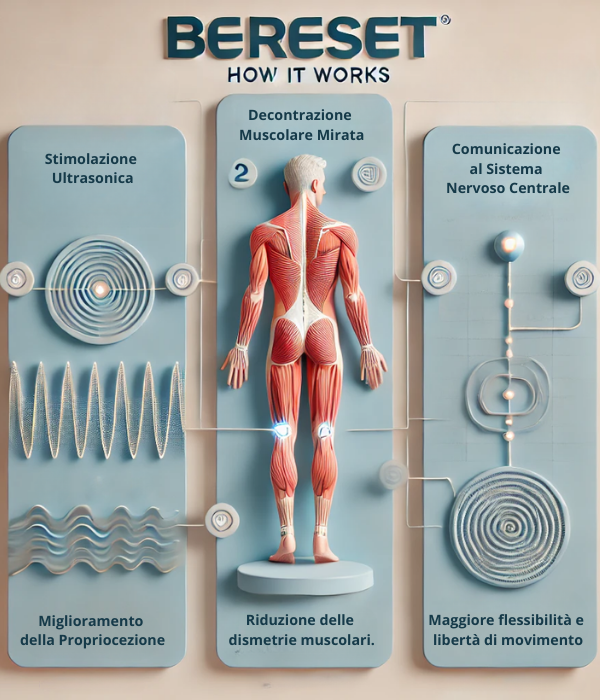 BERESET utilizza onde ultrasoniche a frequenza calibrata per stimolare i recettori cutanei e comunicare con il sistema nervoso centrale. Questo processo permette di resettare lo schema posturale, riducendo tensioni muscolari e migliorando l’equilibrio del corpo.